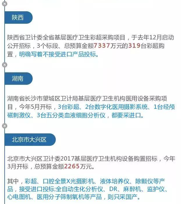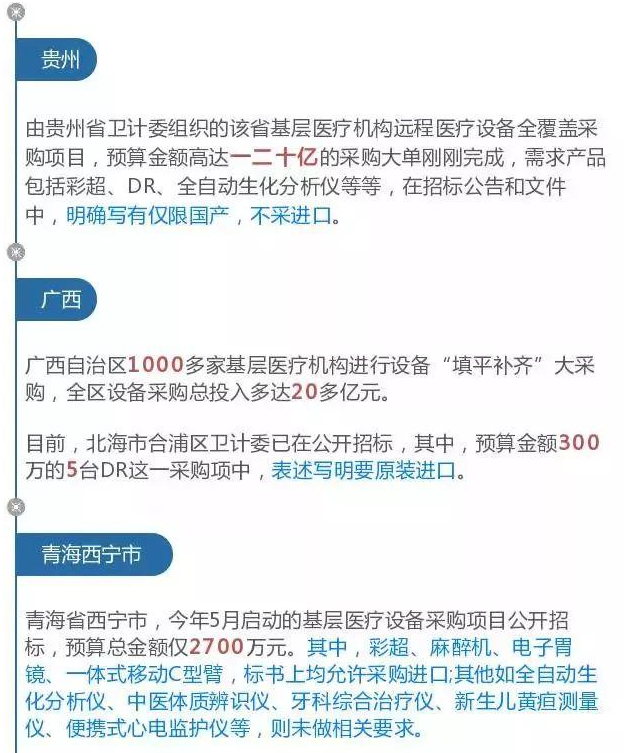 而結合本次海南省衛計委發布的基層醫療衛生機構標準化建設項目設備采購公告來看,預計這468家基層醫療衛生機構將配齊DR、彩超、多普勒生化分析儀等13大類設備!并且明確要求采購國產!
