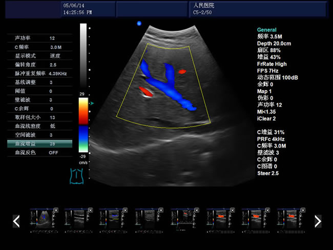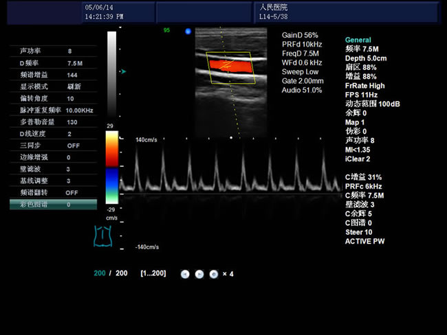 彩色血流圖像調節參數:多普勒頻率、取樣框位置和大小、基線、彩色增益、偏轉角度、壁濾波、累積次數等。