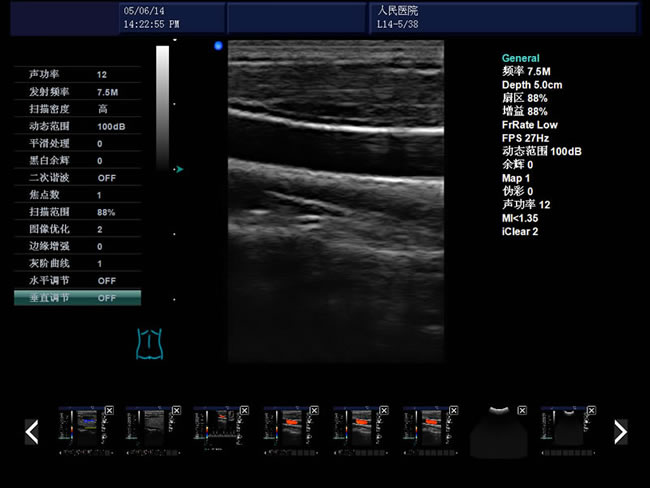 頻率、幀頻、B模式總增益、C模式總增益、D模式總增益、菜單、注釋、灰階帶、穿刺引導線、PRF、壁濾波、血流相關、累積次數、TI熱指數、MI機械指數