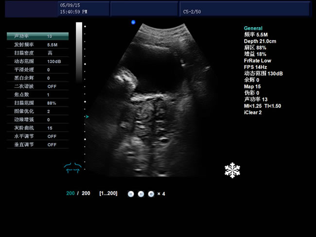 黑白圖像:B、2B、4B、左右B|M、B|D、PW、M、B模式局部放大