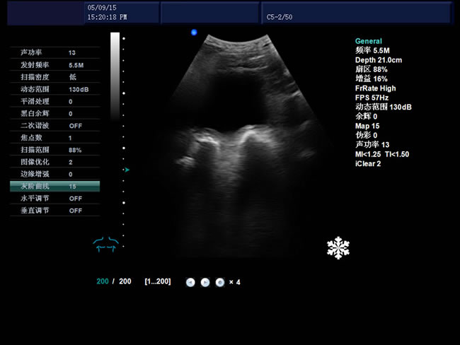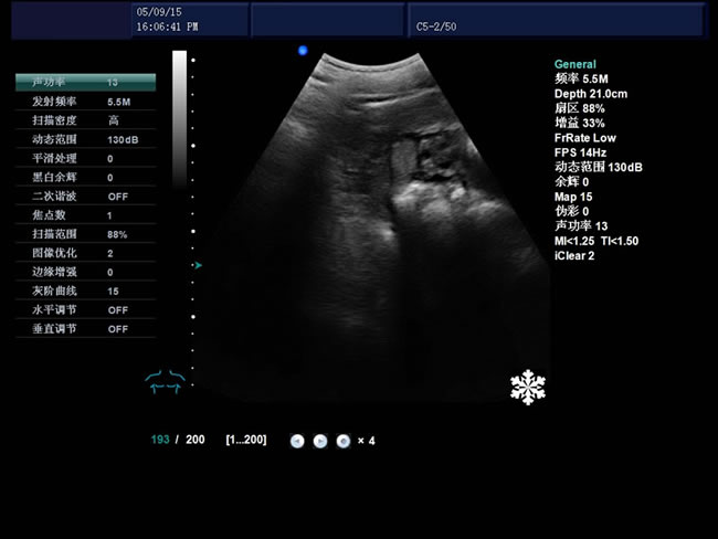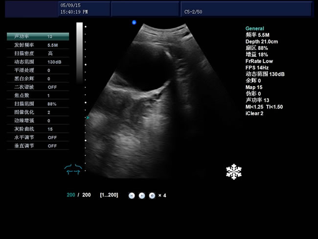 頻率、幀頻、B模式總增益、C模式總增益、D模式總增益、菜單、注釋、灰階帶、穿刺引導線、PRF、壁濾波、血流相關、累積次數、TI熱指數、MI機械指數