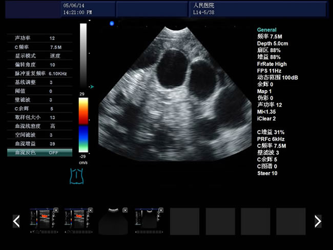 血流圖像:頻譜:B/D、B/C/D CFM:B|C|D、B|C|M、B|C雙實時、PW、CFM、CPA