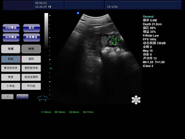B模式基本測量:距離、角度、周長和面積(橢圓法、軌跡法)、體積、直方圖、斷面圖